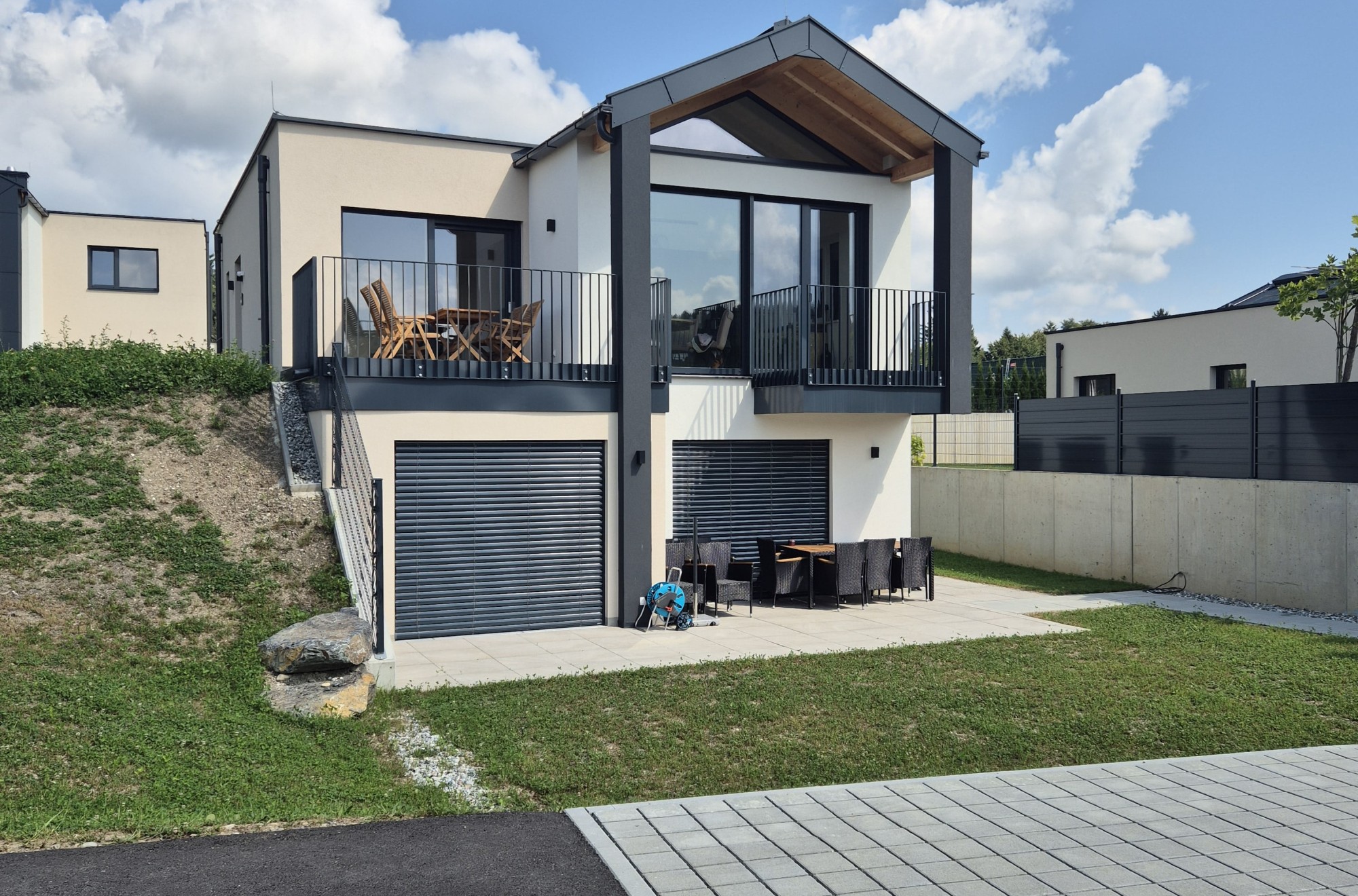 Die Vielzahl der Räume im Objekt lassen vielschichtige Nutzungsmöglichkeiten zu. Künstler haben in diesem Haus eine ideale Atmosphäre. Herzstück ist Erdgeschoß ist der geräumige Wohnbereich mit Kamin und angrenzender Küche als Verbindung zum Essbereich. Die großen Glasanteile bringen sehr viel Licht und Wärme in die Räume. Ein großzügiges Bad ezimmermit Whirl-Wanne, Dusche und WC lädt zum Wohlfühlen ein. Vom Wohnbereich aus gelangt man über einen Wintergarten auf die Terrasse. Über zwei Freitreppen erreicht man das Obergeschoß mit mehreren Zimmern, die Dachgeschoßcharakter bieten. Eine Galerie sowie auch die gegenüber liegende Terrasse bieten einen herrlichen Ausblick ins Grüne. Ein kleines Badezimmer mit Dusche und separaten WC komplettiert das obere Stockwerk. Vor dem Haus befinden sich ein Carport und 3 Abstellplätze. Das Haus wurde 2015/2016 komplett renoviert und befindet sich in ausgezeichnetem Zustand!